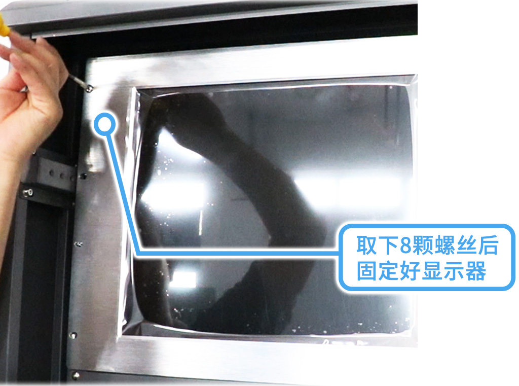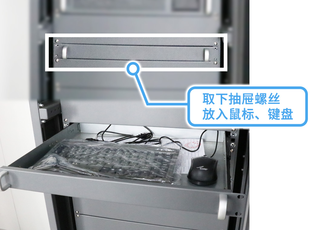 安裝主機(jī)前先取下抽屜螺絲,放置鼠標(biāo)和鍵盤;再用工具固定好顯示屏8顆螺絲,然后翻轉(zhuǎn)到主機(jī)背面;